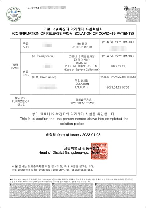 코로나19 완치 확인서(격리 해제 사실 확인서) 인터넷 발급 방법을 알아보았습니다. 2023년이 되면 코로나가 잠잠해지고 자유롭게 해외를 다닐 수 있을 거라고 생각했는데, 계속 변종이 나오고 다시 출입국 절차가 강화되는 국가들이 나오네요. 잘 준비하셔서 계획한 일정을 잘 마치실 수 있길 바랍니다.