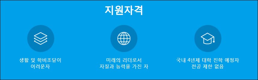 16년간 총 170명의 장학생을 배출했으며 별도의 선발전형과 제3자의 추천도 없이 공개모집을 하는 것으로 알려져 있습니다. 신청서 접수 후 서류심사와 최종면접을 거쳐 장학생을 선별하는데 대학 재학기간 동안 등록금 전액을 지원받을 수 있다는 것이 장점입니다.