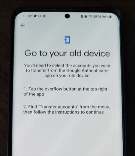 구글 OTP 앱 오른쪽 상단에 있는 세로점 3개 아이콘을 누른 후 계정 전송(Transfer account)을 선택합니다.