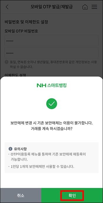 모바일 OTP를 등록하면 기존에 사용하고 있던 보안매체는 이용할 수 없다는 안내가 뜹니다. 확인 버튼을 눌러 주세요. 이제 농협 모바일 OTP 발급/재발급이 완료되었습니다.