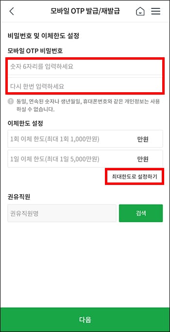 비밀번호 설정 후 이체한도를 설정합니다. 최대한도 이내에서 자신이 직접 설정할 수 있습니다. 농협 모바일 OTP 이체한도는 1회 1천만 원, 1일 5천만 원까지입니다.