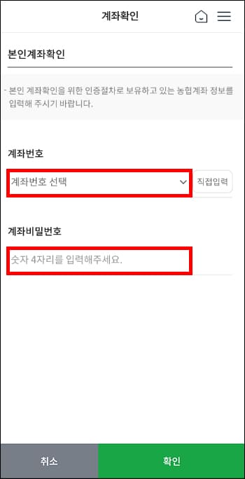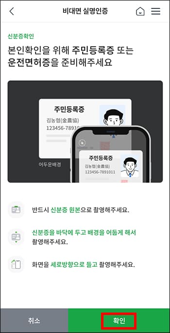 사용 중인 농협 계좌를 선택하고 계좌 비밀번호를 입력합니다. 이제 주민등록증 또는 운전면허증을 촬영하면 본인인증 과정이 끝납니다.
